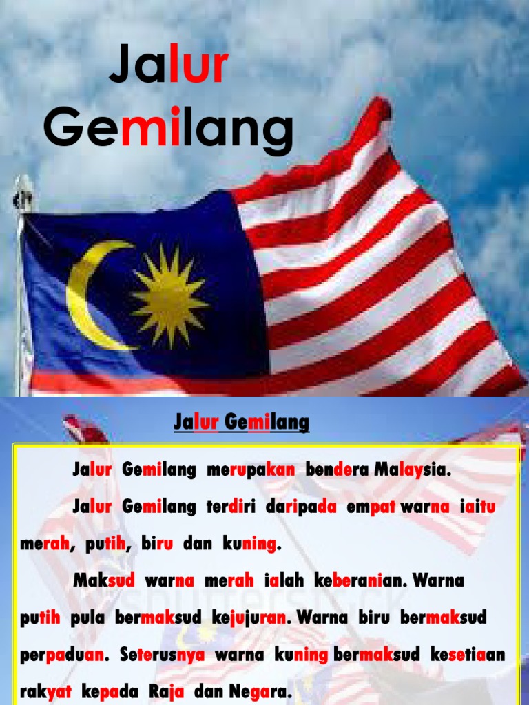 Gemilang bermaksud bercahaya terang benderang dan cemerlang. Kenali Jalur Gemilang. Menjaga nama dan menaikkan imej negara.